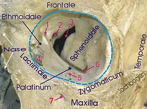 ![]() Diagram of چشم انسان with surrounding superior، oblique، medial و inferior rectus muscles; supraorbital foramen shown above the eye, and inferior orbital fissure inferolaterally. | |
