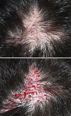 ![]() یک پیوند کاشت مو برای پوشاندن جای زخم عمل جراحی هیدرآدنیت چرکی در پشت سر |
