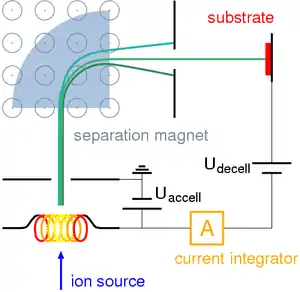 برای کاشت یون، نیاز به یک منبع یون است که با به بکاربردن شتابدهنده ذرهای یونها را میتوان با سرعت زیاد روی سطح مورد نیاز کاشت. هر یون یک اتم یا مولکول است بنابراین مقدار یون انباشت شده روی سطح برابر با انتگرال جریان بر حسب زمان خواهد بود و به این مقدار دز گفته میشود. از آنجا که در کاشت یون جریان در حد میلیآمپر است، دز یون کاشتهشده مقدار کمیست.