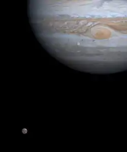 کالیستو در گوشه تصویر، اروپا در مرکز تصویر و مشتری در پسزمینه.