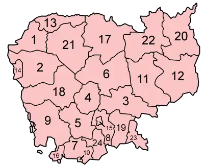 کامبوج به ۲۴ استان (khaet) و یک منطقه شهری (krong) تقسیم شدهاست. تعداد مناطق شهری کامبوج پیش از سال ۲۰۰۸، چهار منطقه بود.