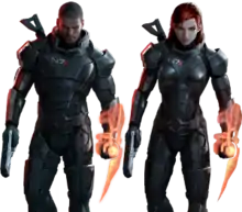 ![]() شخصیت مرد پیشفرض (چپ) و زن (راست) از شپرد، همانطور که بر روی جلد تأثیر فراگیر ۳ ارائه شدهاند | |