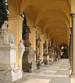 نمایی از یک سایه گذر با مجسمههای مقبره در کامپو ورانو.