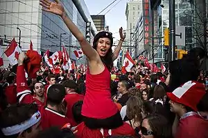 جشن مردم کانادا پس از قهرمانی تیم هاکی روی یخ کانادا در بازی نهایی این دوره