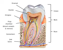در مرکز هر دندان حفرهای به نام مغز دندان وجود دارد که متشکل از بافتهای نرم مانند اعصاب، رگهای خونی و بافتهای همبند است. مغز دندان توسط پوششی از مینا و عاج پوشیده میشود. رگهای خونی مواد غذایی مورد نیاز مغز دندان را تأمین میکنند و اعصاب حسی پیامهای عصبی را به مغز میبرند. در درمان کانال ریشه با وارد کردن آسیبی برگشتناپذیر به مغز دندان، درد از بین میرود.