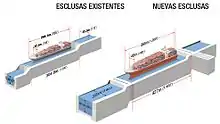 | Locks | ۳ آبگیر بالابر، ۳ آبگیر در پایینبر برای ترانزیت در هر دو خط (۲ ردیف آبگیر؛ آبگیرها در ۳ منطقه ساخته شدهاند) |
