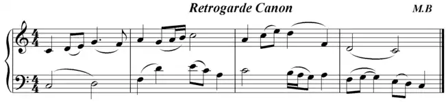 - کانن قهقرایی[persian-alpha 5] نسبت به کاننهای دیگر پیچیدهتر است بدینصورت که صدای دوم، تقلید از ملودی اصلی را از پایان آن شروع میکند و در پایان ملودی اصلی به آغاز میرسد.
