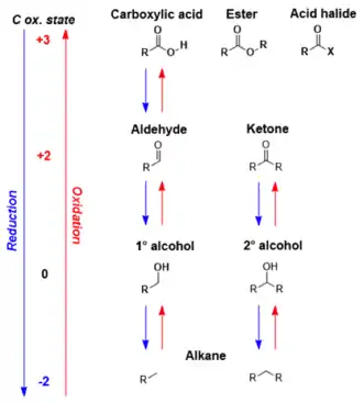 ترکیبات کربونیل متداول عبارتند از: کتون ، آلدهید ، اسیدهای کربوکسیلیک ، استرها و هالیدهای اسید. بسته به قدرت ماده کاهنده، اسیدهای کربوکسیلیک ، استرها و اسیدهای هالید اسید می توانند به آلدهیدها یا یک مرحله فراتر به الکل های نوع یک کاهش پیدا کنند. آلدهیدها و کتونها می توانند به ترتیب به الکل های نوع اول و دوم کاهش یابند.