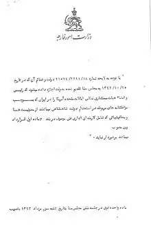 در این موقع که تشکیلات جدید عدلیه شروع میشود لازم میدانم اراده خود را در بابالغاء کاپیتولاسیون که اهمیت آن از دیدگاه حفظ شئون و حقوق مملکت دارای کمال اهمیت است خاطرنشان هیئت دولت نمایم که از طرف دولت موجبات عملی شدن آن فراهم گردد. بنابراین جناب اشرف مأمور است که موجبات اجرای این مقصود را فراهم سازد. رضاشاه پهلوی[12]