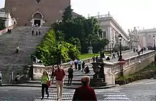 در کنار پلههای قدیمی تر و تند تر که منتهی به آراکوئلی میشوند، میکل آنژ پلهای وسیع و بی پایان به کوردوناتا درست کردهاست که به تدریج به سمت تپه صود میکنند تا به پیاتزاهای مرتفع برسند تا اینکه Campidoglio قاطعانه به حوزهٔ رومیها پشت کند که یکبار نیز دستور آن داده شده بود. این کاخ ساخته شده بود تا به اندازهٔ کافی برای سوارکاران عریض باشد که بتوانند از تپه بدون پیاده شدن بالا روند. نردهها با دو مجسمهٔ شیر مصری از جنس بازالت سیاه در پایهها و سنگ مرمر کاستر و پولوکس در بالایشان قرارگرفتهاند.[1]