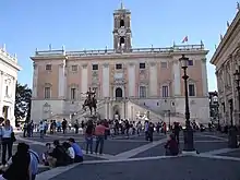 Plazzo Senatori (کاخِ سناتوری) در طی قرون ۱۳ و ۱۴ ساخته شد و در بالای تابالاریوم قرار داشت که یک بار میزبان آرشیو رم باستان بود. بلوکهای پرپرینو از تابالاریوم در سمت چپ کاخ و گوشهٔ برج ناقوس دوباره استفاده شدند. این کاخ هماکنون میزبان سالن شهر رومی است. پلههای دوتایی اش توسط میک آنژ طراحی شده بود. این پلهٔ دوتایی به پلاتزو جایگزین پرواز قدیمی پلهها و لژهای دوتایی شد که باید در سمت راست کاخ میایستادند. راه پله به تنهایی قابل دیدن نیست از نظر اینکه به این ساختمان تعلق داشته باشند ولی باید در مجموعهی پیاتزا به عنوان یک کل ست شود. پلهها که از بالههای هر طرف شروع میشوند به آرامی به سمت بالا میروند تا به گوشهای داخلی برسند پایین بیایند و و به سمت سطح اصلی نما پس بروند. سپس یک فراز ممتد را به سمت هم ادامه میدهند و به سمت درگاه اصلی طبقهٔ دوم همگرا هستند. این فاصله در خط مورب و تغییر مختصر درونی هردو، محورهای درونی را جذب کرده و دو طرف را مرتبط میکند. فواره در مقابل راه پله خداهای رودِ تیبر و نیل را به خوبی Dea Roma نشان میدهد. قسمت بالایی نما توسط میکل آنژ با ستونهای چهارگوش به همراه قرنتسهای عظیمالجثه که با دو ساختمان هماهنگی دارند طراحی شد. برج ناقوسش توسط مارتینو لونگیِ بزرگ طراحی شد و بین سالهای ۱۵۷۸ تا ۱۵۸۲ ساخته شد. نمای اخیر آن جیاکومو دلا پورتا و گیرولامو رینالدی ساخته شدهاست.[1]