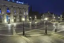 یک نرده، نشانهگذاری شدهاست با مجسمهها در بالای ستونها، ترکیبات را پوشانده و یکی از تأثیرگذارترین طراحیهای میکل آنژ است. دو مجسمهٔ عظیم باستانی کاسترو و پولوکس که نرده را تزیین میکنند همانند آنهایی نیستند که میکل آنژ ارائه داده بود و اکنون در مقابل Plazzo del Quirinale هستند.[1]