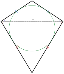 یادآوری میشود با کشیدن دو قطر کایت دو مثلث متساویالساقین پدید میآید در نتیجه چون زاویههای دو ساق مثلث با هم برابر اند پس زاویههای روبرو در کایت هم با هم برابر اند.[2]