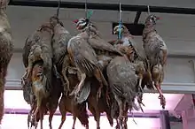 کبکهای پاسرخ برای فروش در مغازهای در انگلستان آویخته شدهاند