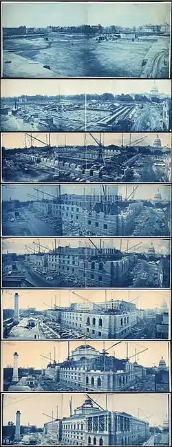 در فاصلهٔ سالهای ۱۸۶۴ تا ۱۸۹۷ آینسوردت رند اسپوفورد، کتابدار کنگره، این کتابخانه را به یک مرکز تحقیقاتی ملی بدل کرد. در سال ۱۸۸۶ و به دنبال تصمیمی که ۱۳ سال قبل کنگره به منظور تغییر معماری ساختمان کتابخانه گرفته بود، جان اسمیث میر و پل پلز مسؤولیت ساخت بنایی با معماری دورهٔ رنسانس ایتالیا را بر عهده گرفتند.[8]