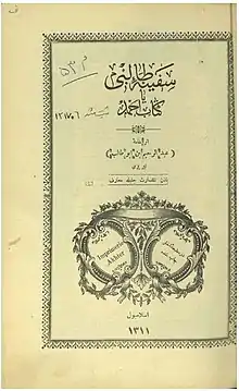 ![]() صفحهٔ اول کتاب، چاپ اول، استانبول: ۱۳۱۱ (ق) | |