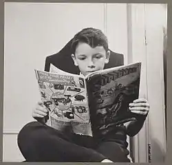 یک پسر مهاجر آلمانی در بچههای مستعمرهٔ ن.ی. ۱۹۴۲، خواندن یک کتاب کمیک از سوپرمن.