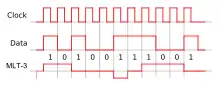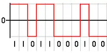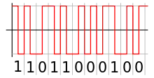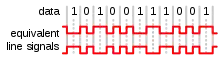 ![]() نمونه coding a binary signal using rectangular pulse amplitude modulation دارای کد قطبی non-return-to-zero ![]() یک نمونه Bipolar encoding, یا AMI. ![]() Encoding of 11011000100 در رمزگذاری منچستر ![]() یک نمونه Differential Manchester encoding ![]() یک نمونه Biphase mark code ![]() یک نمونه MLT-3 encoding. |