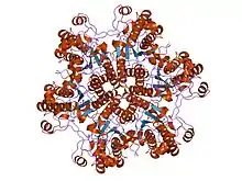 ![]() ساختار بهدست آمده با بلورشناسی پرتو ایکس از «کراتینین آمیدوهیدرولاز» از یکی از انواع سیانوباکترها به نامِ Nostoc pruniforme.[1] | |||||||||