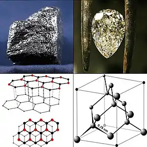 گرافیت که یکی از دگرشکلهای کربن محسوب میشود، یکی از نرمترین مواد شناخته شده و الماس که دگرشکل دیگر کربن است، سختترین ترکیب طبیعی شناخته شده بر روی زمین است. دگرشکلهای کربنی طیف وسیعی از خواص فیزیکی و شیمیایی را منجر میشوند. کربن اتمی دارای عمری کوتاه است که این موضوع موجب میشود شکلهای متنوع مولکولی یا همان دگرشکلهای کربنی شکل بگیرند. سه دگرشکل شناخته شده کربن عبارتاند از کربن بیشکل گرافیت و الماس. دگرشکل دیگر کربن، فولرن است که زمانی گونهای خاص و عجیب بهشمار میآمد اما امروزه بهصورت متداول تهیه و در تحقیقات علمی مورد استفاده قرار میگیرد. خانواده دگرشکلهای فولرنی خود شامل فولرن باکمینستر،[22][54] نانولوله کربنی،[55] نانوجوانه کربنی[56] و نانوالیاف کربنی[57][58] است. علاوهبر دگرشکلهای مرسوم، چندین نوع دگرشکل غیرمعمول نیز از کربن شناخته شدهاست که عبارتاند از لونسدالیت،[59] کربن شیشهای،[24] نانوفوم کربنی[60] و کربن استیلنی خطی یا همان کاربین.[61]