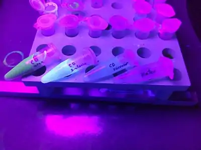 کربن استیلنی خطی که با نام کاربین نیز شناخته میشود، دارای ساختار شیمیایی C≡C-)n-) است.[61] کربن در این نوع دگرشکل، دارای هیبریداسیون از نوع sp است و شکل کلی دگرشکل مانند یک پلیمر است که دارای پیوندهای یگانه و سهگانه بهصورت یکدرمیان است. کاربین توجه زیادی را در نانوفناوری به خود جلب کردهاست چراکه دارای مدول یانگ برابر با ۴۰ برابر الماس است.[75] کربن دات در سال ۲۰۰۴ بهطور تصادفی در خالص سازی نانولولههای کربنی تک جداره کشف شد.[76] این کشف مطالعات گستردهای را برای بهرهبرداری از ویژگیهای فلورسانس کربن دات ایجاد کرد.[77]