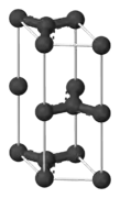 در فشارهای بالا، کربن دگرشکلهای فشردهتری مانند الماس را تشکیل میدهد که تقریباً دارای چگالی دوبرابر گرافیت است. برخلاف گرافیت، در ساختار الماس، هر اتم بهصورت چهاروجهی با چهار اتم دیگر پیوند برقرار میکند و منجر به تشکیل یک شبکه سه بعدی از حلقههای شش عضوی منقبض شده میشود. الماس همانند سیلیسیم و ژرمانیم، دارای ساختار مکعبی است و بهعلت قدرت پیوندهای کربن-کربن، سختترین ماده طبیعی شناخته شده در مقابل خراشیده شدن است. برخلاف باور عمومی که بیان میکند «الماسها تا ابد باقی میمانند»، الماس در شرایط استاندارد (دما: ۲۹۸ کلوین، فشار: ۱۰٬۰۰۰ پاسکال[67]) از نظر ترمودینامیکی ناپایدار است (انرژی استاندارد تشکیل گیبس (ΔfG°) برای الماس در دمای ۲۹۸ کلوین = ۲٫۹ کیلوژول بر مول[68]) و در نهایت به گرافیت تبدیل میشود. باتوجه به سد انرژی بالای فعالسازی، تبدیل الماس به گرافیت در دمای اتاق بهقدری آهسته است که قابل تشخیص نیست. باقیمانده کربنی که دچار تغییر فاز شدهاست بهصورت تجربی مورد بررسی قرار نگرفتهاست اما مطالعات نظری اخیر با استفاده از روش نظریه تابعی چگالی به این نتیجه رسیدهاست که در شرایط رسیدن دما و فشار بهترتیب به صفر کلوین و صفر پاسکال، الماس به ساختاری با استحکامی در حدود ۱/۱ کیلوژول بر مول بیشتر از گرافیت تبدیل میشود. تحت برخی شرایط، کربن به لونسدالیت متبلور میشود، ساختاری که یک شبکه بلوری ششگوشه است و در آن، همه اتمها، همانند آنچه در الماس رخ میدهد، بهصورت کووالانسی با یکدیگر پیوند برقرار میکنند.[59]