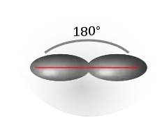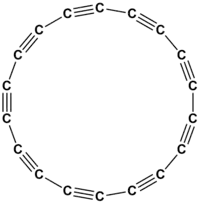 هیبریداسیون sp ناشی از مشارکت تنها یک اوربیتال اتمی پی (px ،py یا pz) و یک اوربیتال اتمی اس (s) است. از بین دگرشکلهای کربن، ترکیب سیکلو(۱۸)کربن گونهای است که اتمهای تشکیل دهنده آن، دارای هیبریداسیون sp و درنتیجه پیوندهای سهگانه است. سیکلو(۱۸)کربن مولکولی است که ساختاری حلقوی دارد و متشکل از ۱۸ اتم کربن دارای پیوندهای سهگانه یکی در میان است. این ساختار، کوچکترین ترکیب از خانواده سیکلو[n]کربنها است و طبق محاسبات انجام شده با داشتن انرژی فشار حلقه[lower-alpha 11] برابر ۷۲ کیلوکالری بر مول، پیشبینی میشود که یک ترکیب پایدار از لحاظ ترمودینامیکی باشد. رایجترین پیوندهای سهگانه بین دو اتم کربن، در آلکینها دیده میشود. سیانیدها و ایزوسیانیدها نیز پیوند سهگانه دارند. برخی مولکولها دواتمی مانند دینیتروژن و کربن مونوکسید نیز پیوند سهگانه دارند. این پیوند در فرمول اسکلتی با سه خط افقی (≡) نمایش داده میشود.[51][52][53]