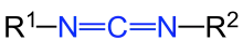 ساختار کلی کربودیایمید: بخش اصلی گروه عاملی که به رنگ آبی است با گروه های جانبی(R) متصل شده است.