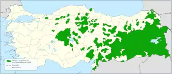 سرزمینهای کردنشین در ترکیه در تقسیمات کشوری ترکیه در گذشته ۱۱ استان (به ترکی: ایل) بودند.[50] و بعدتر بر اثر تقسیمات کشوری مجدد، همان سرزمینها را این بار به ۱۷ استان تقسیم کردند.[51] و بعدتر در آغاز دهه ۹۰ بر اثر تقسیمات کشوری جدیدتر، همان سرزمینها را این بار به ۲۱ استان تقسیم کردند.[51] کشور ترکیه دارای ۸۱ استان است که بر اساس دانشنامه بریتانیکا کردها در ۲۱ استان کردنشین در اکثریت هستند. کردستان ترکیه شامل تمام ۱۵ استان آناتولی شرقی و ۶ استان از ۸ استان آناتولی جنوب شرقی (به جز دو استان استان غازی عینتاب و استان کیلیس) است. همچنین زازاها و خود کردها در سایر مناطق و استانهای ترکیه نیز حضور دارند. برای نمونه در خارج از کردستان ترکیه در استان غازی عینتاب (پارێزگای دیلۆک) در آناتولی جنوب شرقی یا استان آقسرای (پارێزگای ئاکسارای) یا استان سیواس (پارێزگای سێواس) در ناحیه آناتولی مرکزی تعداد زیادی کرد و زازا زندگی می کنند و اقلیت هایی پرشمار در ناحیه مدیترانه و ناحیه اژه و ناحیه مرمره دارند ولی در ناحیه دریای سیاه جمعیت بسیار کمی دارند.