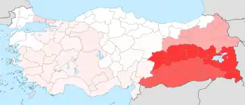 از استانهای ترکیه ۲۱ استان به عنوان مناطق با اکثریت کرد معرفی میشود. هم در این مناطق اقلیتهای قابل توجه عرب، ارمنی، آشوری و ترک وجود دارد و هم در سایر مناطق ترکیه اقلیتهای قابل توجهی از کردها همانند کردهای استانبول و کردهای آناتولی مرکزی و سایر اقوام وجود دارند. استانهای هر ناحیه به ترتیب وسعت مرتب شدهاند:[52]