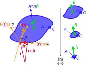 سمت راست انتگرال خطی روی ناحیه ی بینهایت کوچکِ C است که به سمت صفر میل می کند. و n بردار نرمال ناحیه ی C است.