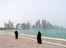 زنان در حال قدمزنی در کرنیش دوحه به همراه خطافق دوحه در پس زمینه