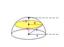نخست حجم نیم کره را بدست میآوریم و چون کره متقارن است حجم یک کرهٔ کامل دو برابر حجم نیم کره میشود. فرض کنید این کره از تعداد بی شماری دیسک دایرهای با ضخامت بسیار کم ساخته شدهاست. مجموع (انتگرال) حجم این دیسکها، حجم کرهٔ مورد نظر را میسازد. محور تمام این دیسکها بر روی محور yها قرار دارد در نتیجه دیسکی که بر روی نقطهٔ h = ۰ قرار دارد، شعاعی برابر با r دارد (s = r) و دیسکی که در نقطهٔ h = r قرار دارد، شعاعی برابر با صفر دارد (s = ۰).