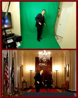 - ● Top panel: From YouTube video "President Obama on Death of Osama SPOOF- BEHIND THE SCENES" (WebCite archive) posted to Crosson's secondary YouTube channel "Iman" on 8 May 2011. ● Bottom panel: The final (composite) video "President Obama on Death of Osama bin Laden (SPOOF)" (WebCite archive) posted to Crosson's YouTube channel "Alphacat" on 4 May 2011.