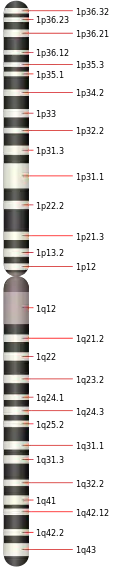 - Gregory SG, Barlow KF, McLay KE; et al. (May 2006). "The DNA sequence and biological annotation of human chromosome 1". Nature. 441 (7091): 315–21. Bibcode:2006Natur.441..315G. doi:10.1038/nature04727. PMID 16710414.