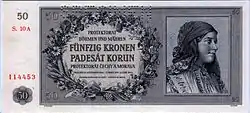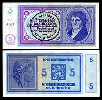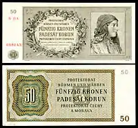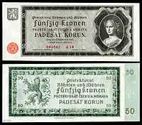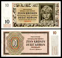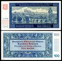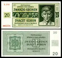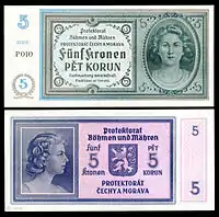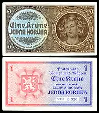 اسکناس یک کرونی جمهوری چکسلواکی با مهر سیاه رنگ کشور تحتالحمایه آلمان نازی با نام بوهم و موراویا بر روی نشان سمت چپ آن.