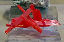 | دلیلنامگذاری | با چاقو بریده میشود-لومینسانس قهوهای تیره-ازکانیهای مشابه آن رآلگار و سینابراست. از کلمه یونانی Krokos به معنای زعفران گرفته شدهاست. |