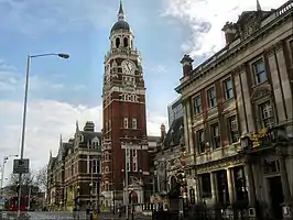 ![]() ![]() From top to bottom: The old Town Hall and Clocktower، with the Spreadeagle on the foreground, Katharine Street; the Grants Building, High Street | |
