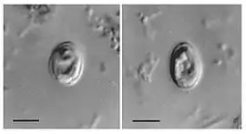 | سلول اوسایت کریپتوزپوریدیوم موریس که در مدفوع انسان پیدا شده است. | |