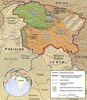 ناحیه کشمیر مورد ادعای هند و پاکستان است. هر دو کشور بهطور جداگانه بخشهایی از این منطقه را اداره میکنند و این مناطق توسط خط کنترل از هم جدا شدهاند. این مناطق از زمان استقلال پاکستان، مورد منازعه هند و پاکستان بوده و چند دفعه باعث درگیری بین دو کشور شده است هند این مناطق را جزئی از خود میداند در صورتی که این مناطق مسلمان نشین است و پاکستان خواستار آزادی و یا الحاق به خاک خود شده است گاندی رهبر هند نیز در زمان حیاتش خواستار این بود که خود مردم کشمیر خود تصمیم بگیرند به کدام کشور الحاق میشوند اما اکنون دولت هند برای منافع بسیار زیاد این مناطق از انتخابات سرباز میزند[3] علاوه بر این در این بین بیش از ۱۱ هزار زن مسلمان مورد تجاوز توسط سربازان ارتش هند قرار گرفته اند[4][5][6][7][8] و در سال ۲۰۱۶ تجاوز مرد هندی به دختر ۸ ساله ای خشم دولت و مردم پاکستان، کشمیر و تمام مردم و کشورهای مسلمان را برانگیخت، احزاب و کشور های مختلف اسلامی بارها خواستار رسیدگی نهاد های حقوق بشری به مسئله کشمیر شده اند اما تاکنون بی نتیجه بوده است