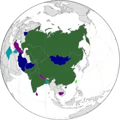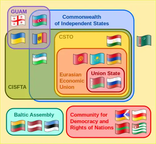 - کشورهای آسیای مرکزی شامل قزاقستان، قرقیزستان، تاجیکستان و ازبکستان (همچون بلاروس) اعضای CIS هستند و در سازمانهای منطقهای متعدد که روسیه را به عنوان محرک خود دارند میباشند. چنین سازمانهایی شامل مجمع اقتصادی اوراسیا (که بعداً با اتحاد اقتصادی اوراسیا ترکیب شد که تاجیکستان و ازبکستان عضو آن نیستند)، سازمان پیمان امنیت جمعی، و سازمان همکاری شانگهای هستند. در گروه آخر تنها از زمانی که ازبکستان از گوام بیرون آمد و در پی عضویت در EurAsEc و CSTO رفت متمایز میشوند.