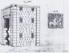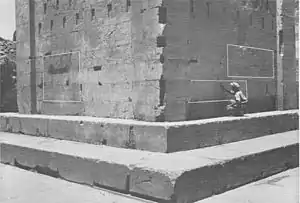 یک پلکان سیپلهای (هر پله به درازی ۲ تا ۲٫۱۲ متر؛ پهنای ۲۶ سانتیمتر و ارتفاع ۲۶ سانتیمتر) در سینهٔ دیوار شمالی تعبیه شده که به آستانهٔ درگاه ورودی میرسد. بدین ترتیب، بهخوبی مشخص است که میخواستهاند بنا شکل یک برج سه طبقه را داشته باشد که هر طبقهاش هفت در و دریچه دارد، اما فقط یک در را حقیقی درست کردهاند و بقیه را به صورت پنجرههای کور بیمنفذ نگه داشتهاند.[17]