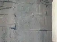 برای اینکه یکنواختی و یکرنگی بنا زیاد مشخص نشود، دو تنوع معماری در آن داده شده؛ یکی اینکه طاقچههای دو لبهای از یک یا دو تختهسنگ سیاه خاکستری ساخته و در دیوارها نشاندهاند و دوم اینکه در قسمت بالا و میانی دیوارها، گودیهای مستطیلی کوچکی کندهاند که ظرافت خاصی به چهرهٔ بنا میدهند. سنگهای سیاه را احتمالاً از کوه مهر در تخت جمشید آورده باشند و در سه ردیف به ترتیب زیر در دیوارها قرار دادهاند:[16]