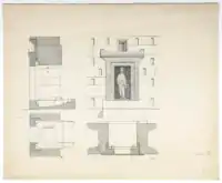 - در شش متری زیر سقف، دو طاقچهٔ مستطیلی متوسط در سه جبهه و یک در بزرگ مستطیلی در جبههٔ شمال.