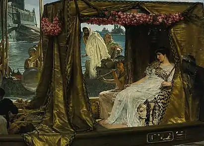 در سال ۴۱ پیش از میلاد مارک آنتونی، یکی از زمامداران سهگانهٔ روم در خلأ قدرت پیش آمده پس از درگذشت سزار، یار صمیمیاش، کوئینتوس دلیوس، را به مصر فرستاد تا کلئوپاترا را به طرسوس احضار کند تا ملکه دیداری با مارک آنتونی داشته باشد و به سؤالات او در رابطه با میزان وفاداریاش پاسخ دهد زیرا که شنیده میشد در کوران جنگ داخلی روم، کلئوپاترا پول زیادی به کاسیوس پرداخت کردهاست. اما به نظر میرسد این موضوع بهانهای بیش نبوده و هدف اصلی آنتونی از ملاقات با کلئوپاترا حصول اطمینان نسبت به پشتیبانی ملکه از جنگ محتملالوقوع او علیه پارتیان بودهاست. کلئوپاترا در هیبتی فریبنده و رویایی ظاهر شد و آنتونی آنچنان مسحور و عاشق زیبایی او شد که رزم و سیاست را از یاد برد و ترجیح داد که زمستان سال ۴۱ و ۴۰ پیش از میلاد را در کنار کلئوپاترا در اسکندریه بگذراند.