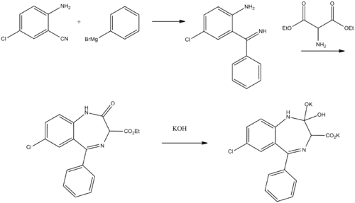 کلرازپات را میتوان با سنتز ۲-آمینو-۵-کلرو بنزونیتریل با فنیل منیزیم برمید شروع کرد تا به ۲-آمینو-۵-کلربنزوفنونایمین تبدیل شود.[3][4][5] واکنش این ماده با آمینومالونیک استر، یک محصول هتروسیکلشده به نام، ۷-کلرو-۳٬۱-دیهیدرو-۳-کاربتوکسی-۵-فنیل-2 H- بنزودیازپین-۲-اون را به همراه دارد. سپس با آبکافت این محصول با استفاده از محلول الکلی پتاسیم هیدروکسید یک نمک دیپتاسیم از کلرازپات تشکیل میشود.
