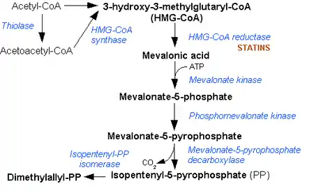 سپس موالونات به ایزوپنتینیل پیروفسفات در ۳ واکنش که به ATP نیاز دارند تبدیل میشود. موالونات به ایزوپنتینل پیروفسفات دی کربوکسید تبدیل میشود، که یک متابولیت کلیدی برای واکنشهای بیولوژیکی مختلف میباشد. سه مولکول از ایزوپنتنیل پیروفسفات متراکم میشود تا فارنسیل پیروفسفات از طریق عمل گرانیل انتقالی شکل دهد. دو مولکول از فارنسیل پیروفسفات سپس متراکم شده تا اسکوئالین را توسط عمل ترکیب اسکوئالین درشبکه آندوپلاسمی شکل دهد.