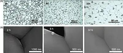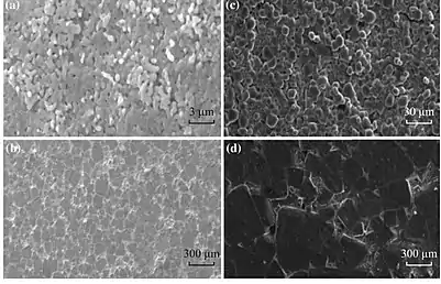 عکس از ساختار میکروسکوپی پختهشدن سرامیک CCTO که برای سه ساعت در دمای °۹۰۰ سانتیگراد (شکل a)، در دمای °۱۰۶۰سانتیگراد (شکل b)، در دمای ۱۱۰۰ برای سه ساعت(شکلc) و برای ۲۴ ساعت(شکلd).