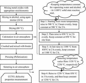 در ابتدا اکسید فلزات(TiO2 , CaCO3 , CuO)با نسبت استوکیومتری مناسب مخلوط میشوند و سپس با الکل مخلوط میشوند. مخلوط در دمای °۸۰ سانتیگراد خشکشده و در خلاء تسویه میشود. در ادامه بازهم در همزن خرد و مخلوط میشوند و سپس مواد فشرده میشوند. دمای مواد فشرده شده از°۸۵۰ سانتیگراد بهتدریج در مدت سه ساعت به °۱۲۵۰ سانتیگراد میرسد و مواد بهمدت دو ساعت درهمین دما نگهداشته میشوند تا پختهشوند. پساز پختهشدن در خلاء، خواص دیالکتریکی CCTO اندازهگیری میشوند.