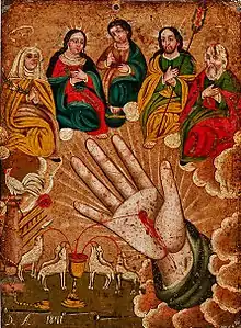 دست خدا (Mano Poderosa) oil on tin retablo by Donanciano Aguilar, 1871, 13 x 9.5 in, موزه هنر ال پسو، accession 2014.17.393